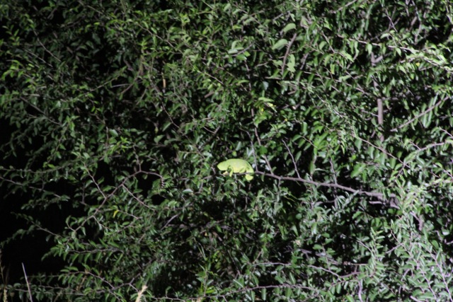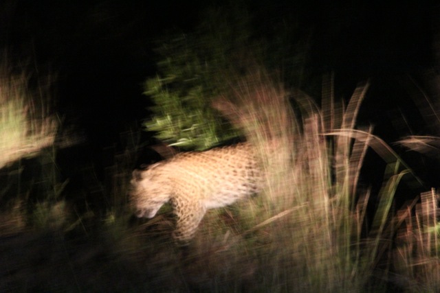 We saw the leopard twice; she was just walking along the road towards us. She crossed in front and wandered off into the bush. Suddenly, 3 other nearby safari trucks descended; there were 4 spotlights searching for her. After a short while our driver saw her just nonchalantly walking along the road again. She wasn’t scared or bothered by our presence.