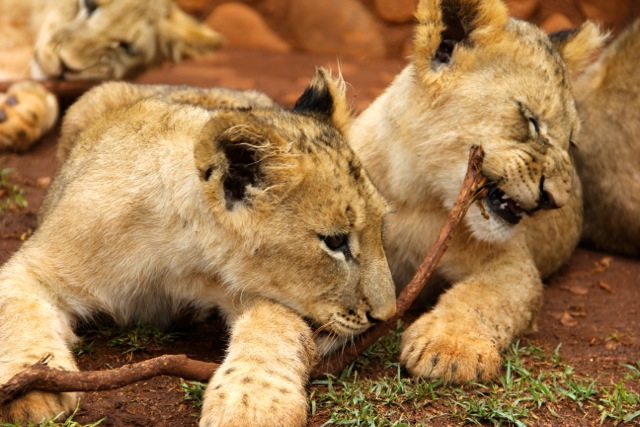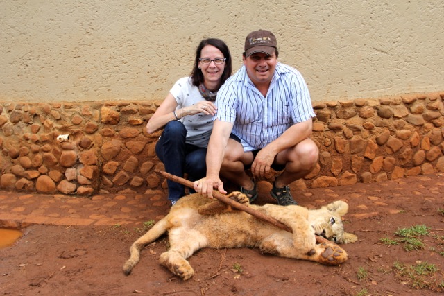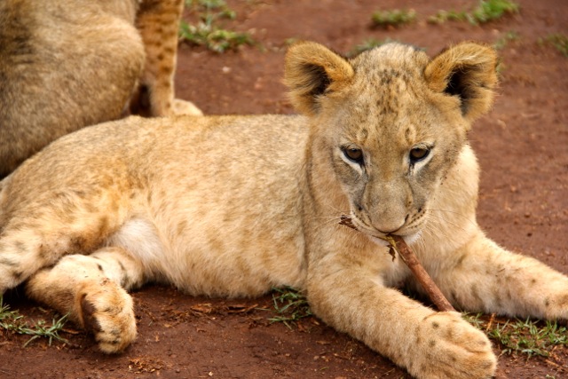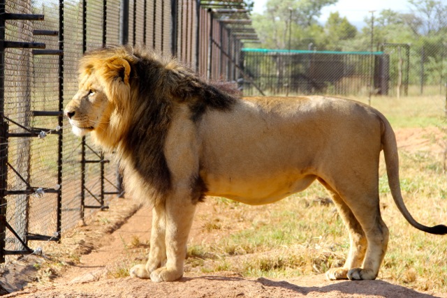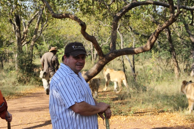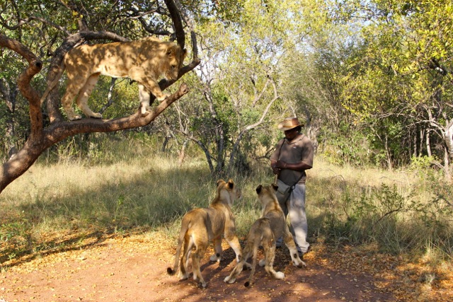Three lions are taken on the walks; the bigger one in our group was nearly 2 years old and will soon be retired. Recently, while out on a walk, he ran off the track and killed a sable.